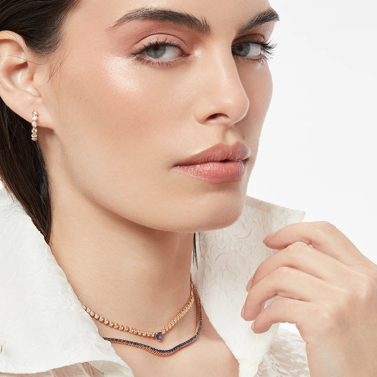 Argollitas en oro amarillo 18k y brillantes. Choker en oro amarillo 18k, brillantes y zafiros